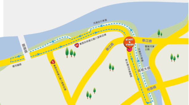 很高興這場路跑的地點是在河堤,讓我可以邊看美麗的河景邊慢跑,一共會經過四座橋:光復橋、萬板大橋、華江橋和新海橋。
