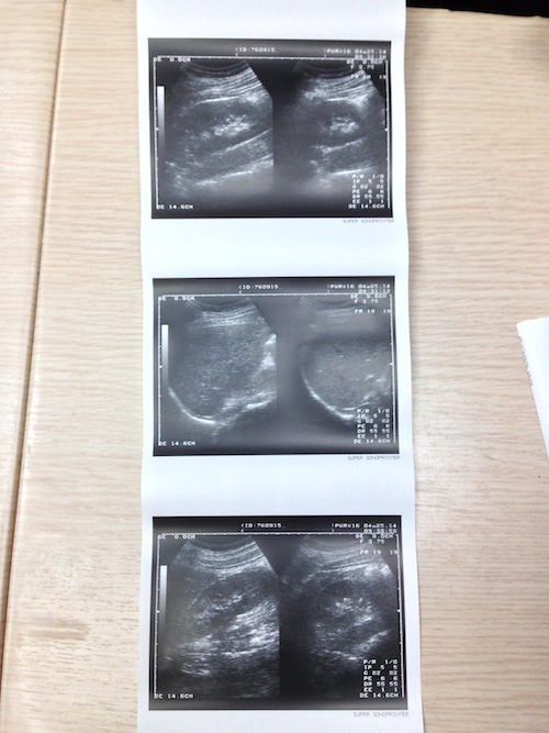 超音波給我的感覺是冰冰涼涼,所長拿著一根有滾輪的棒子,塗上特殊液體,然後在我肚子和脖子滾動,一旁的小螢幕有黑白畫面在動,就像電影裡和肥皂劇裡的情節那樣⋯⋯