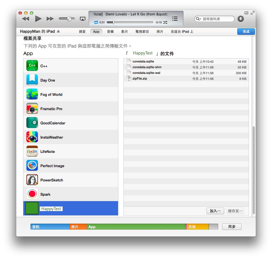首先就是要在專案Info.plist設定Application supports iTunes file sharing (UIFileSharingEnabled)為YES,馬上編譯執行,開啟iTunes軟體,就能看到HappyTest2出現在「檔案共享」清單上喲!表示透過iTunes檔案共享 (File Share through iTunes)功能已開啟~