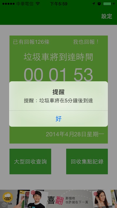 區域通知的做法已經在指定時間本地通知 (Local Notification in Particular Time),它的行為其實有兩種,一種是當APP為背景執行時出現訊息,另一種則是APP在前景執行時跳出提示。