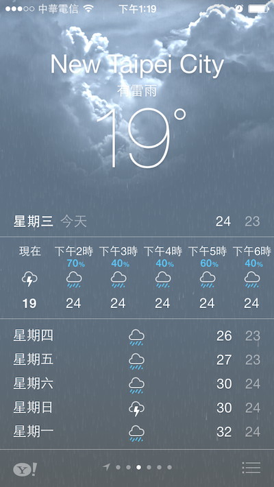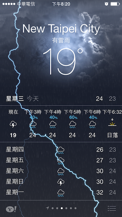 不過這篇的重點在於,上次我介紹天氣APP,這次剛好可以截到打雷的圖!這讓我更加讚賞這個精緻的APP,真讓人愛不釋手,也難怪Apple會把Yahoo做的氣象APP那為己用!哈~要是可以螢幕錄影就好啦!只是那種功能應該需要Jail Break才可能辦到囉~iOS沒有內建程式,若開發者有開發,這是跨APP的行為。