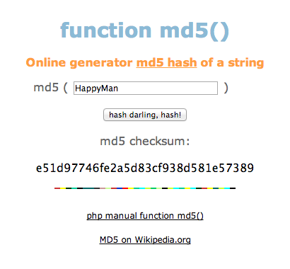例如:HappyMan的MD5是e51d97746fe2a5d83cf938d581e57389,共32個字元。