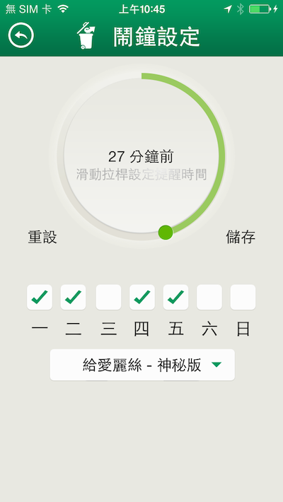 我們時常會錯過倒垃圾的時間,但現在不用擔心了!因為我們可以設定鬧鐘,在垃圾車抵達前15分鐘(60分鐘內皆可設定)讓鬧鐘響起,然後悠然自在地拿垃圾去丟~