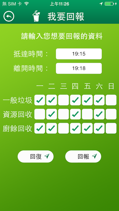 資料庫難免會有錯誤,加上垃圾車實際在路上行駛會遇到的狀況不一,所以若發現實際抵達時間與資料顯示時間差異太大,儘管回報給我們知道,回報後馬上能讓其他使用者看到剛所回報的抵達時間喔!