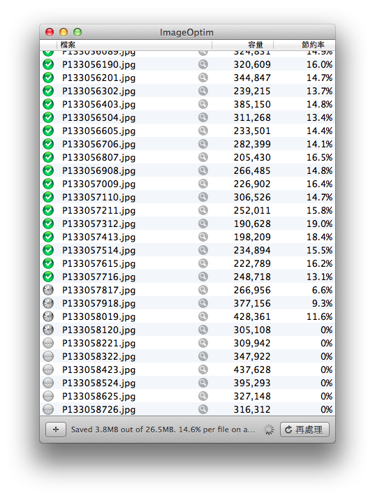 自己本身很愛拍照記錄生活,時常會整理相片,將想要分享的相片編輯修改,上傳到有限的網路空間,實際使用ImageOptim後發現還能再讓影像容量縮小10%-20%!
