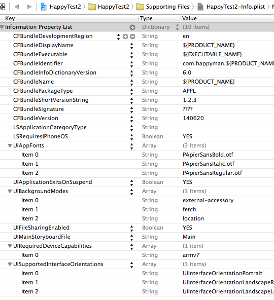 14. Fonts provide by application(鍵名:UIAppFonts)為一個陣列形態的設定值。用來指定應用程式所使用的外部字型。你可以在應用程式內使用自己的字型檔,只要將字型檔案加入到專案內,在設定值指定字型檔名稱後,就能在程式碼裡面使用這些字型。
