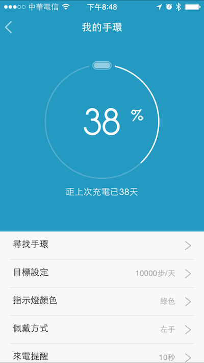 剛拿到小米手環,38天還沒用藍芽配對,電力還有38%呢!