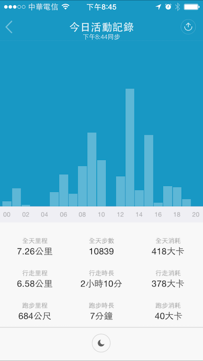 它會記錄每個時段的步數、時間、距離與熱量消耗。