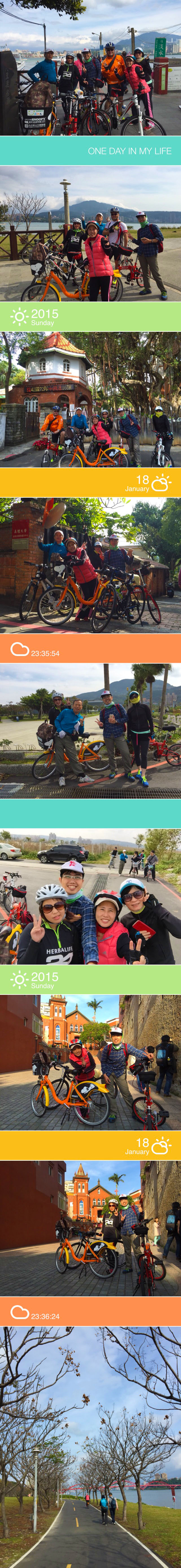 這一路上景色優美,很高興今天天氣晴朗,可以看到藍天白雲,儘管拼命地踩著踏板,還是拿出心愛的iPhone 6,趁機會捕捉眼前美景!騎過新店溪濱、騎上重翠大橋、騎過台北都會公園,在超商休息、在八里觀光區品嚐美食,搭乘渡輪到對岸淡水,最後在淡水海關碼頭欣賞畫家的作品。