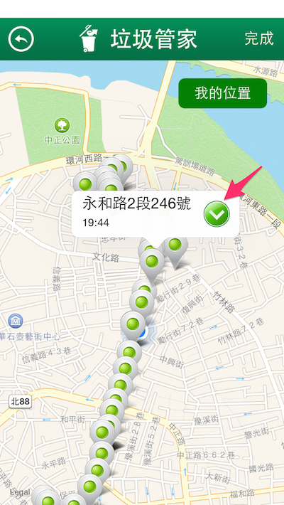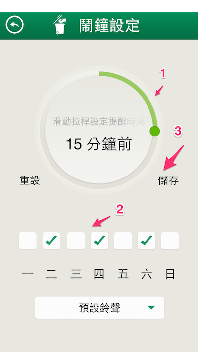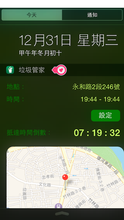 注意:前提是要先到垃圾管家App中設定倒垃圾的地點與時間。 接下來說明如何設定倒垃圾的地點與時間~
