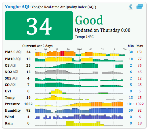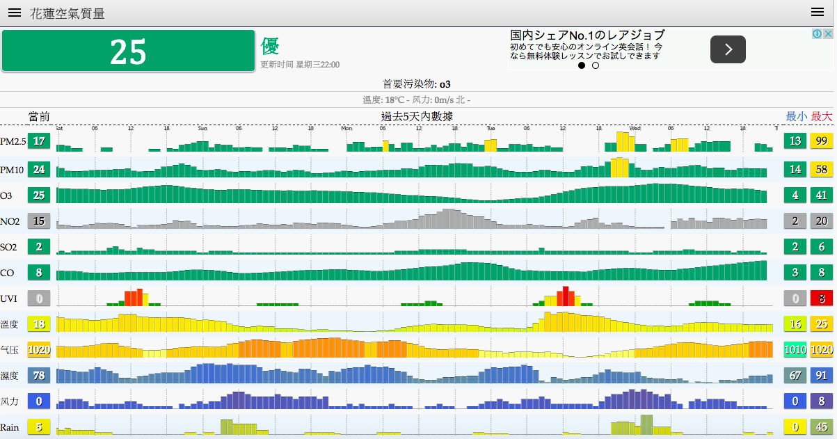 公司在永和,當然也就要觀察是否適合工作。今日有下雨,所以空氣質量較好,可見到下圖前半段為非雨天的昨天,後半段為雨天的今天。