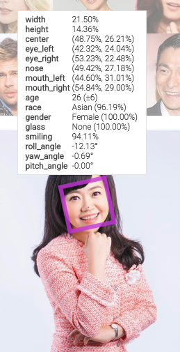 最近我發現號稱比臉書收購的人臉辨識平台Face還強的平台Face++,如本文第一張圖,它除了可偵測人臉位置外,還能知道人臉轉幾度、性別、年齡、種族、微笑程度、戴眼鏡與否等等資訊!