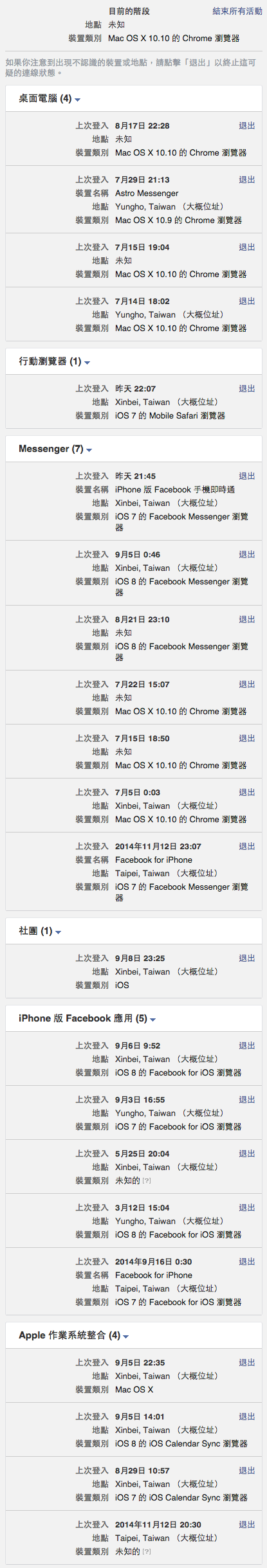 可以看到這張圖,在臉書集團管轄的範圍內所知道的帳號登入時間與地點,甚至知道我所使用的軟體與裝置!臉書帳號管理基本上是我登入後,除非自己登出,否則它不會幫我登出~那萬一我在他人裝置上登入,卻忘了登出該怎麼辦?好在臉書帳號管理做得很棒,當我想起某時某地我使用不是我的裝置或軟體登入臉書帳號時,就到臉書帳號管理去找那個標的,然後按下「退出」,我便可以看到,那個不是我的裝置馬上跳出「Session Expired」,也就是強制把我的帳號登出!從此不用擔心登入別人的裝置囉~