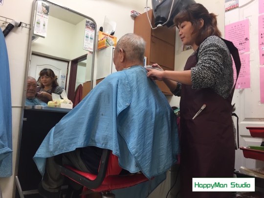 一條黃色布幕讓我輕易找到店家,右轉後就看能看到,剛好有位年輕人剪好亮麗的頭髮要離開,接著就是老伯伯剪髮時間。一位老婆婆看到我來,微笑地跟我說可以先坐下來等。我看到一個小妹妹約五歲很活潑,離開時詢問幫我剪髮的阿姨,原來她來自越南,已經能用國語與客人溝通。她知道我是第一次來剪髮後,便拿出名片給我,請我幫她宣傳。