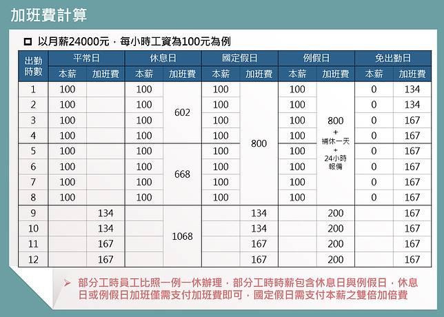 - 平日加班費不變,休假日和例假日加班費增加