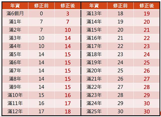 - 特休日增加,採週年制計算