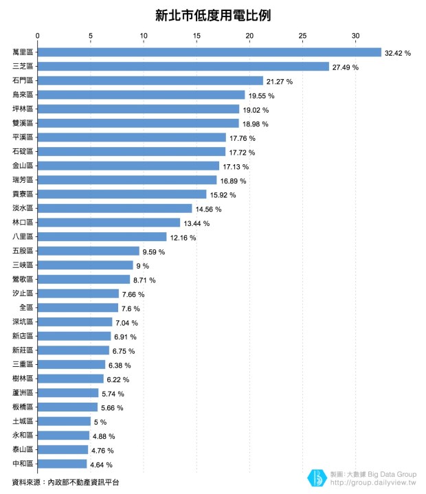 接下來仔細瞧新北市各大區,人口密集度多的地方如中和區和永和區,低用電比例就非常小,先前住板橋區,現在住中和區,生活便利程度相當好,房租若合理的話就可以安居樂業。