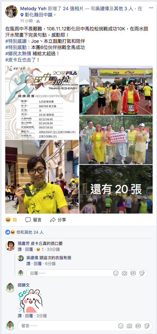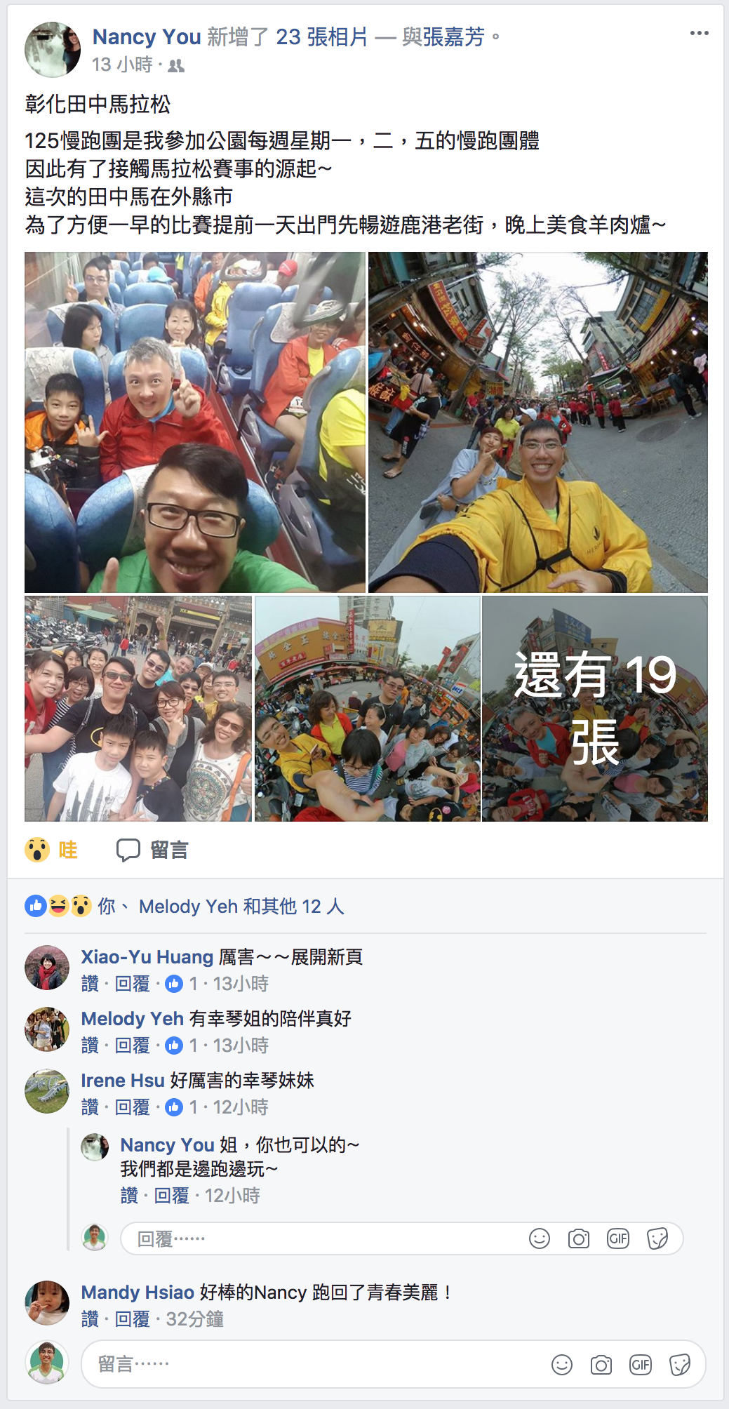 2017 田中馬拉松,我們125超慢跑團有20位跑友參與,我們每個人都興致勃勃地參與其中,活動結束後,會在臉書張貼自己的心得與相片,這一切珍貴難得的回憶一定要保存下來,於是我就截圖紀錄!