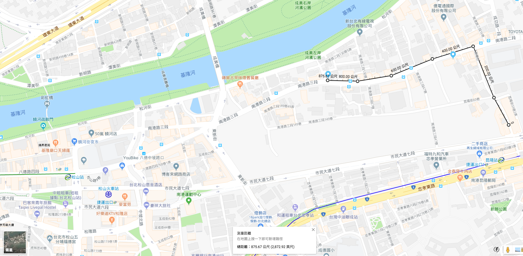 我找到一家距離約1公里的德隆機車行,它有12則評論,平均有4.8顆星,我便決定要牽過去。Google Map有測量距離的工具,真是方便哪~發現我離我公司最近的松山站和昆陽站很近!