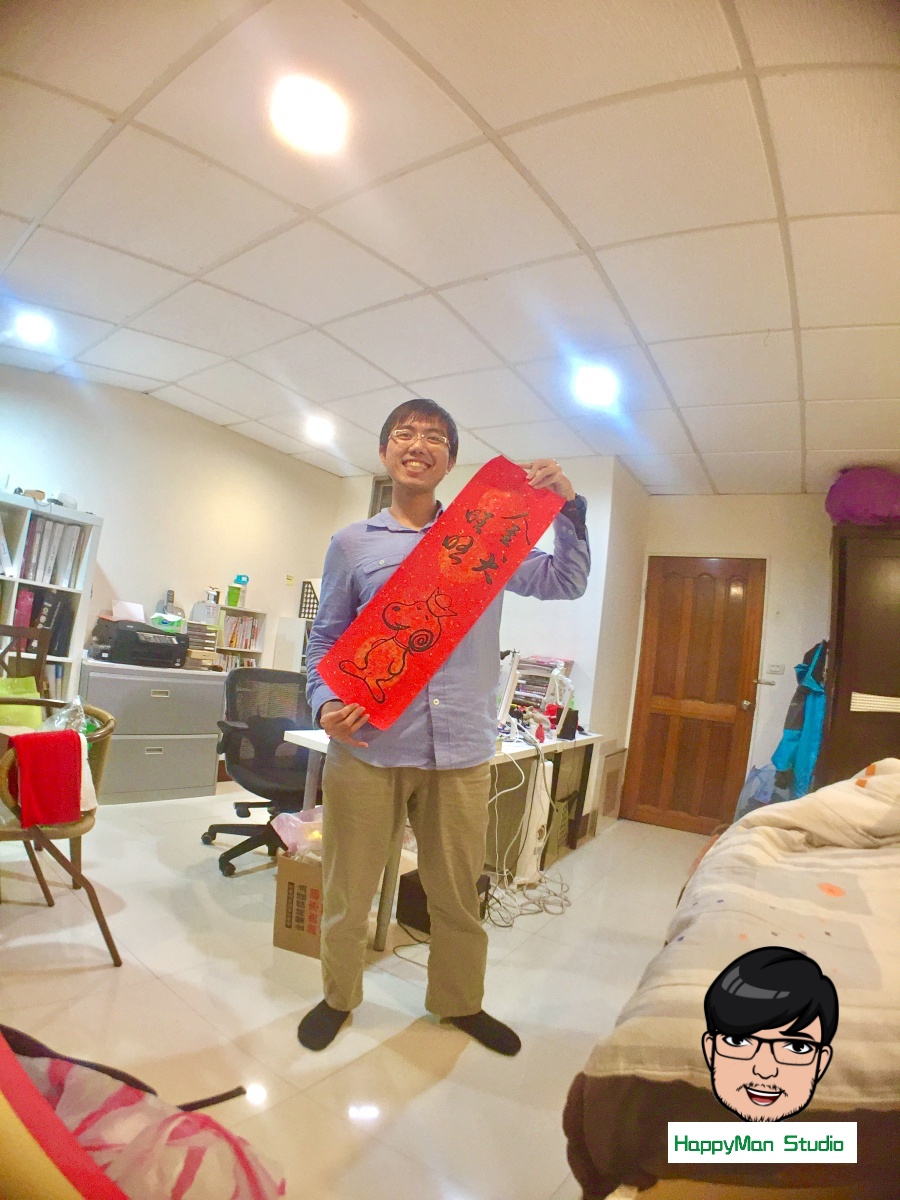 每年我的同學也是同事的JK,都會把潛藏的藝術天份,充分揮灑在紅色春聯上!2017年他寫了「永遠逍遙」給我,今2018年則是畫了隻旺旺金犬-史奴比!