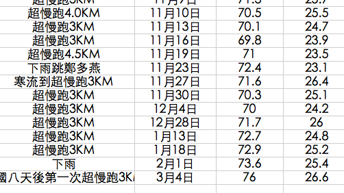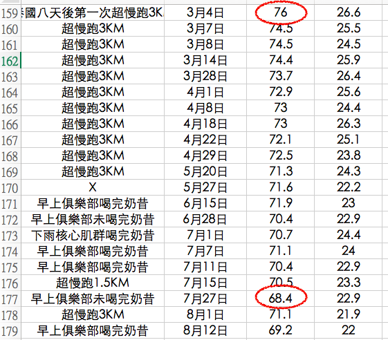 回顧Excel上的紀錄,我最低體重62公斤,被阿婆餵養之後陸續增肥,到2016年3月剛從國外自由行回來,體重就來到76公斤!!!任何人只要看到我的臉,就知道我變胖啦⋯⋯