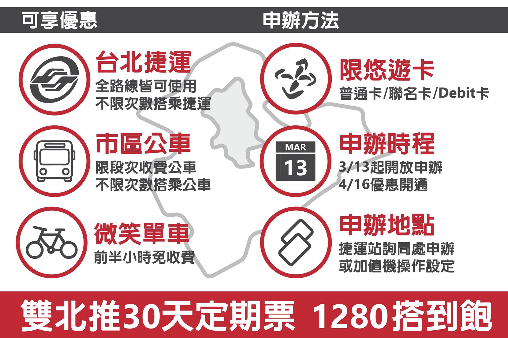 參考:雙北推出「吃到飽月票」只要1280元,怎麼買比較划算?、台北捷運粉絲團、公共運輸定期票 Q&A。