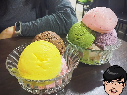來看一下口味與價目表。口味有巧克力、抹茶、香草、百香果、香蕉、芋頭、芒果、藍莓、草莓、檸檬雪酪。2球60元,3球80元,能在這麼優質的環境裡吃冰淇淋,嘴巴會降溫,感情會升溫。