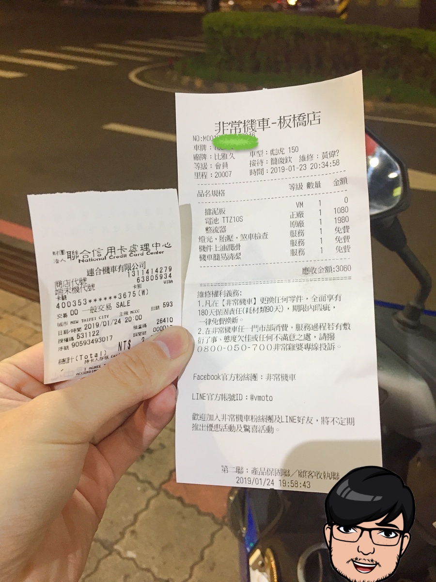 我的愛車似乎每一年內都會有機車零件要做更換,去年(2018年)一月差不多這時候換了第二次的高壓線圈,今年(2019年)一月換了第一次整流器和第二次電瓶,恰巧里程數剛超過20007公里,2017年2月才做里程數一萬公里保養,約兩年後終於又再次滿一萬公里。😛