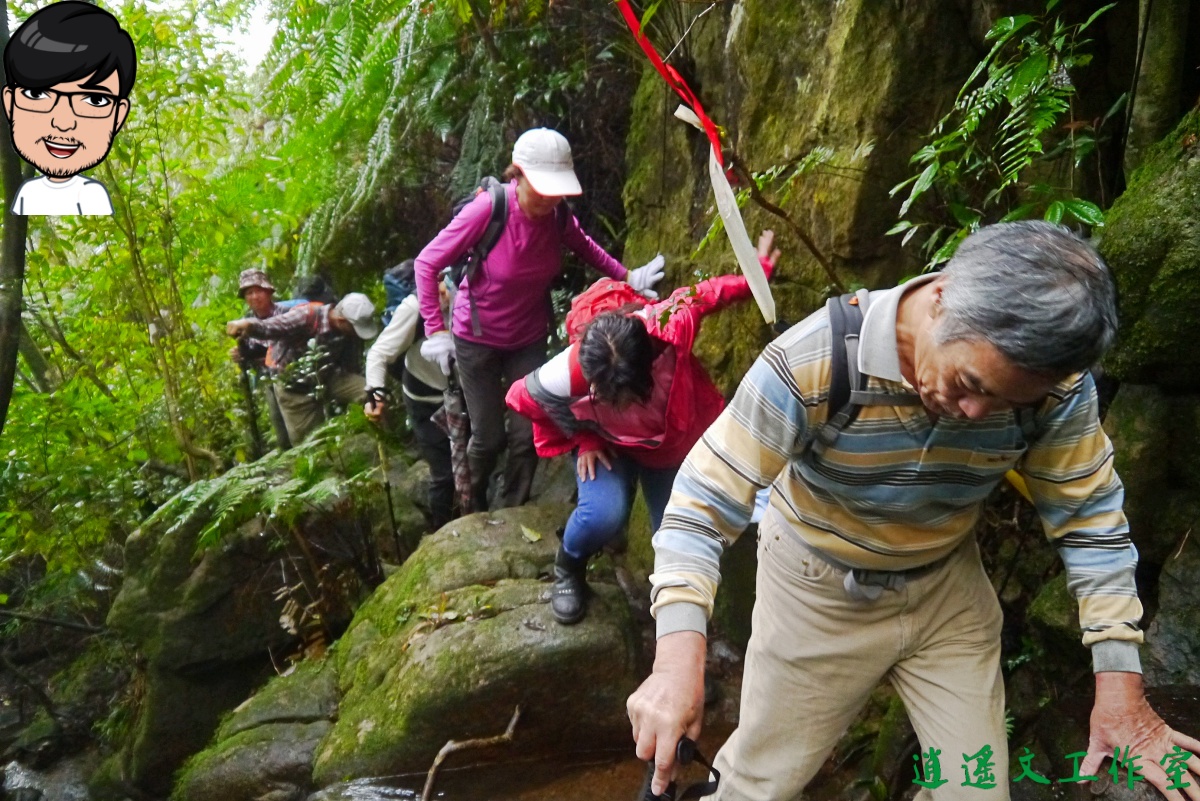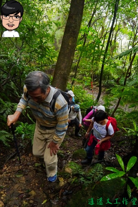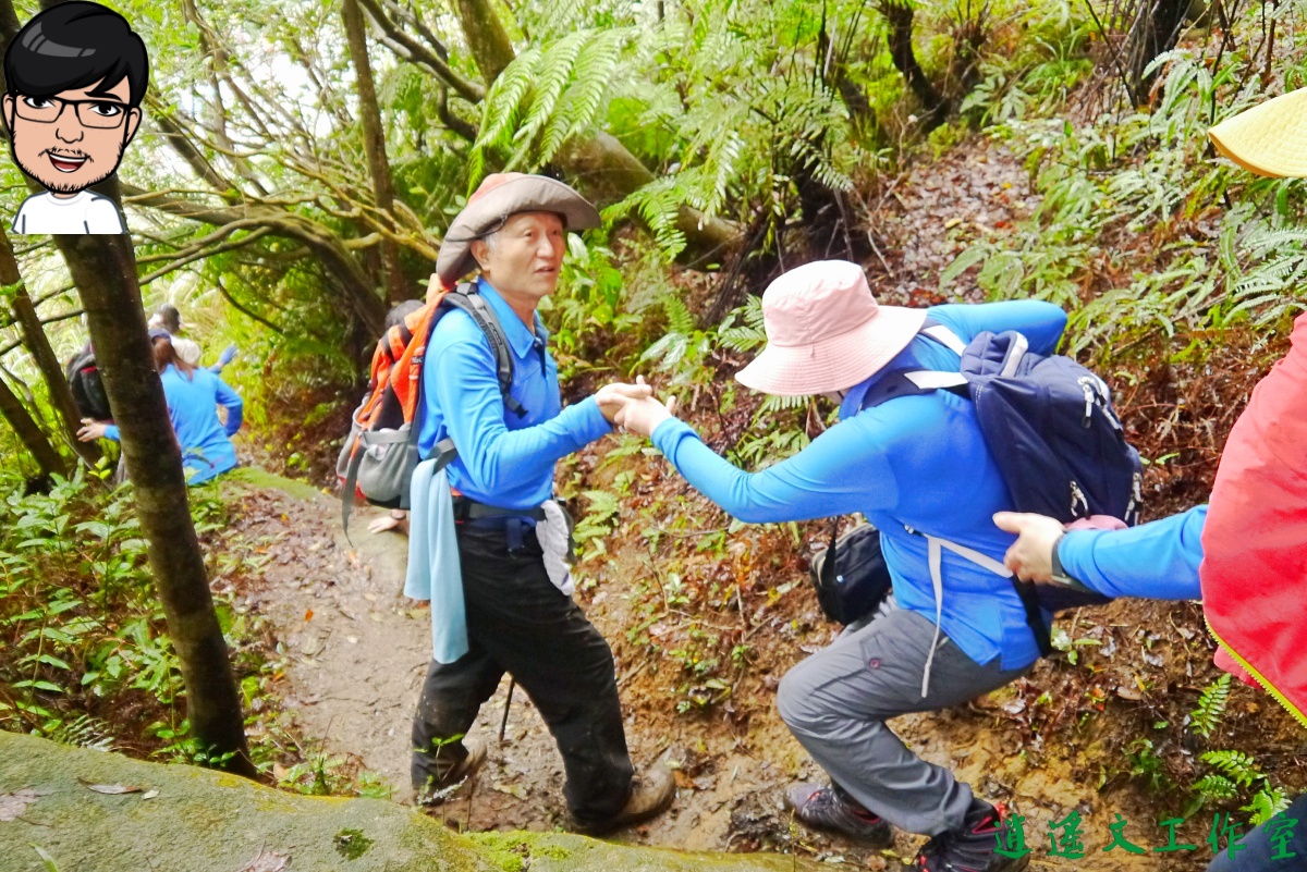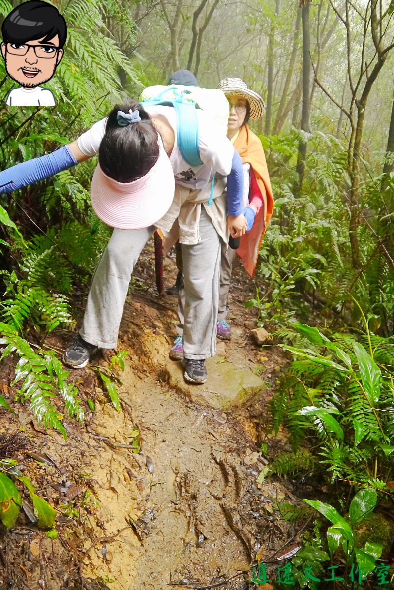 在平地以為天氣好,然而在山區千變萬化,之前下過雨讓地上泥濘不堪,爬走時要小心滑倒,王大哥在一處爬坡滑倒,幸好我在後頭幫忙扶著。另有一位60多歲山友,抬頭看時我覺得他要倒下,立馬扶助他不要摔太大力。