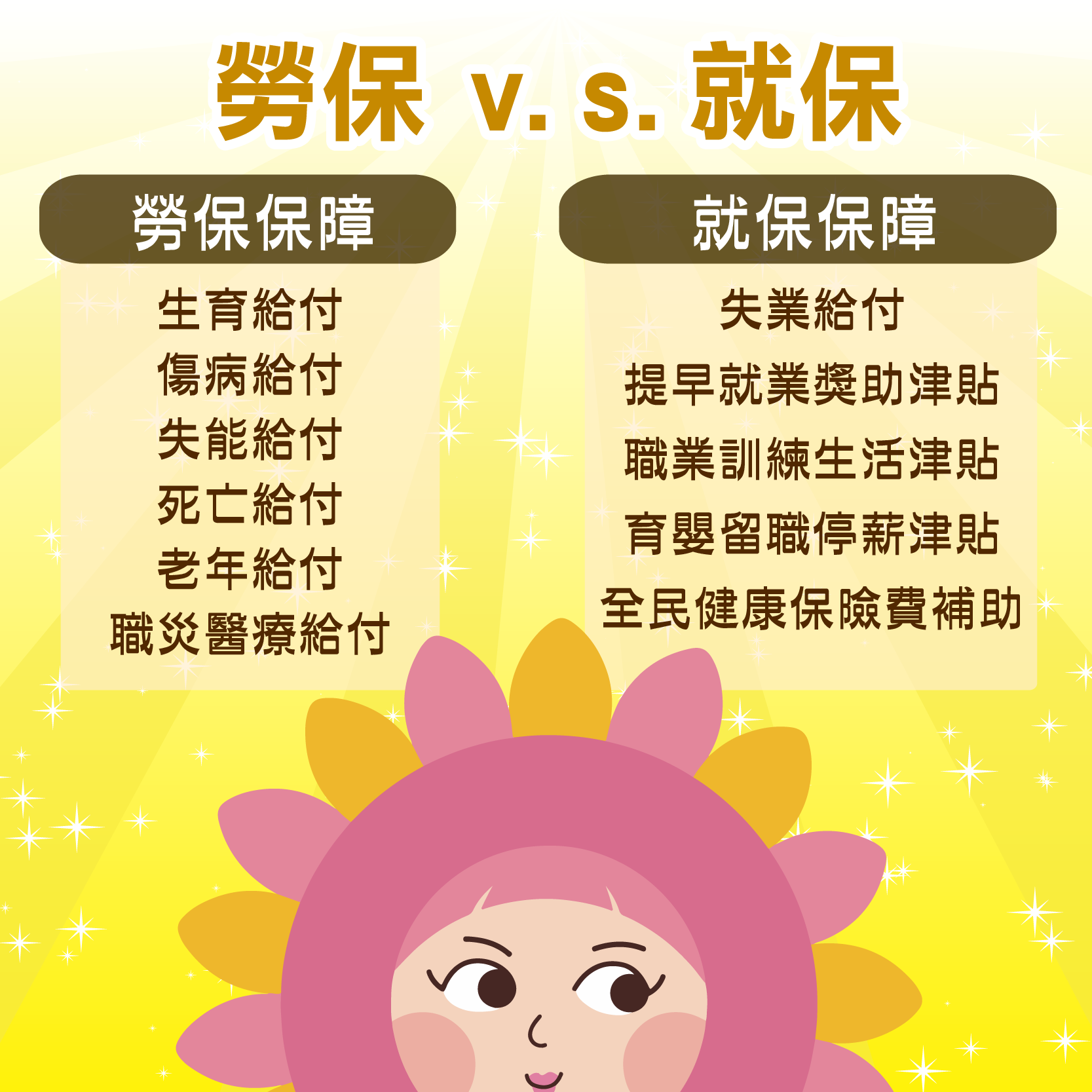 就保和勞保是不同的保障制度。就保是保障勞工朋友在沒有工作時(如失業或育嬰留職停薪)的基本生活;而勞保則是主要在照顧勞工工作期間及未來退休時的生活唷!