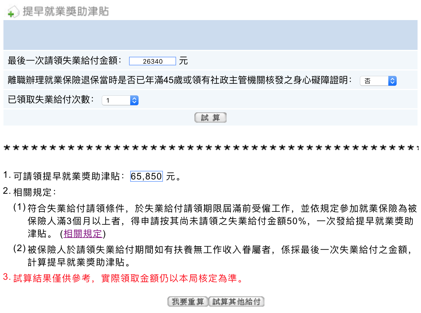 因為我只領一個月,就找到好的工作,剩下沒有領的五個月變成我的提早就業獎金!可領到的金額為五個月沒有領的一半當獎金65850元(26340元 X 5個月 X 0.5)。