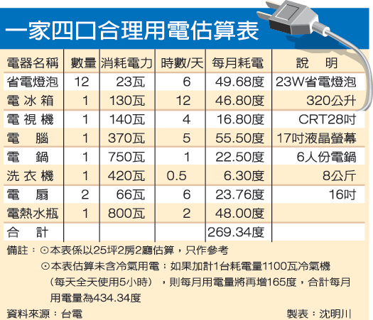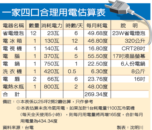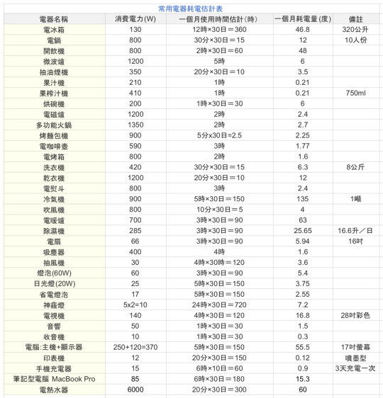 本表每月使用時間為估計值。若欲估算自家用電,請依家中電器品實際耗電量及每月使用時間自行估算喔~