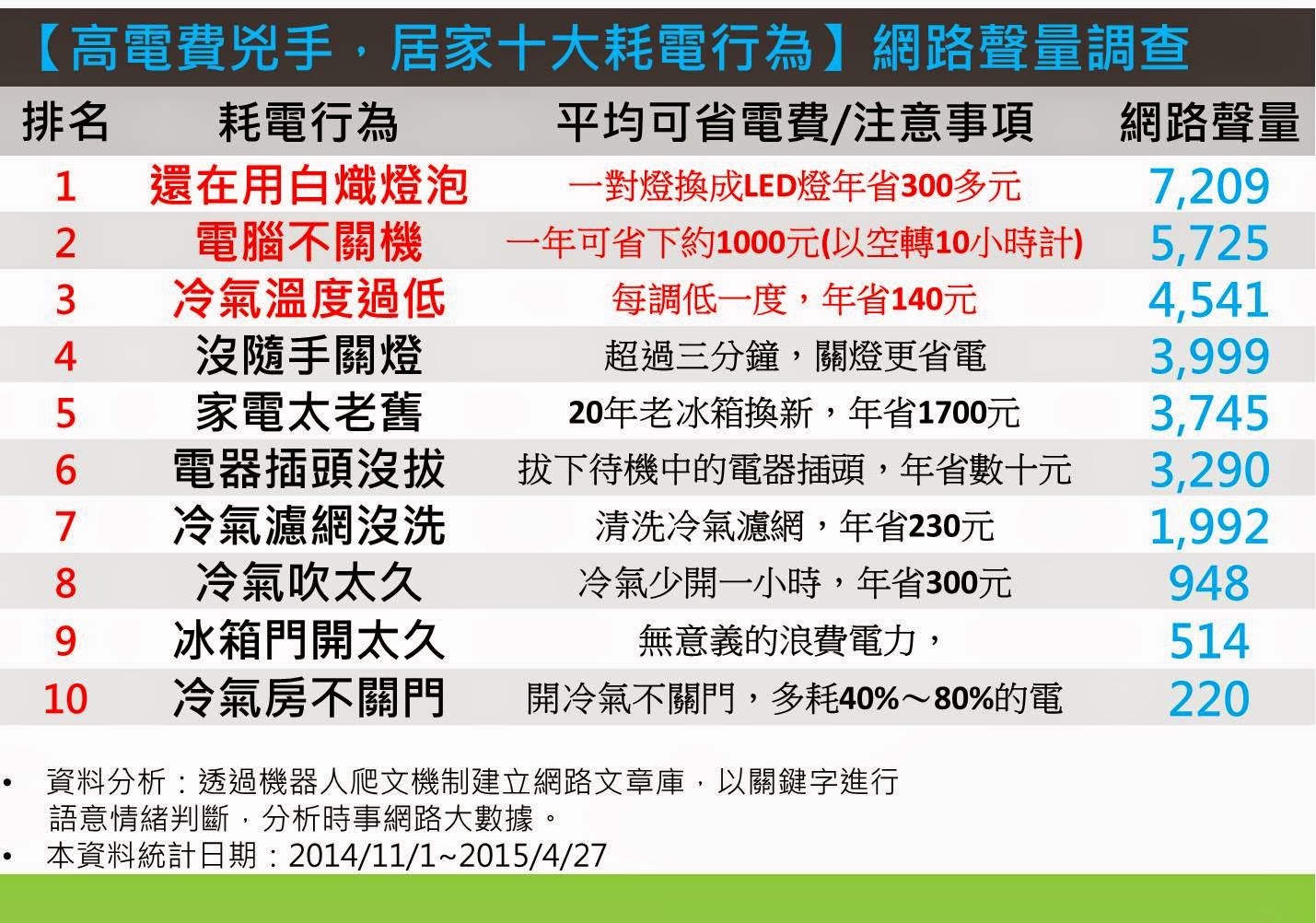 一月份因房東覺得我使用電太少,因此我特別做了些電器耗電研究。大部分的電器可以由下表看出相對耗電多少。
