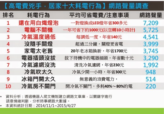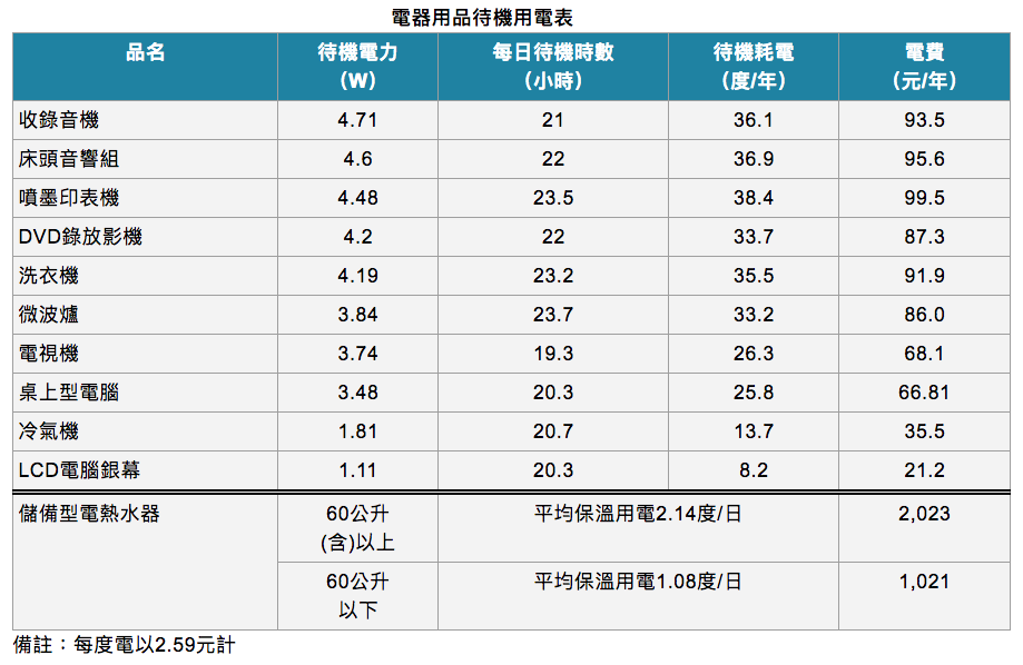 台灣各類電器待機消耗電量