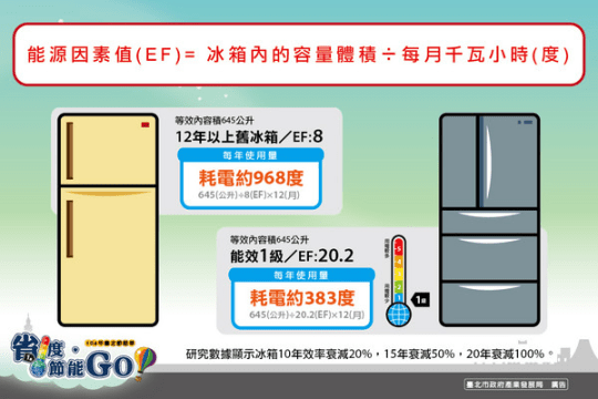 冰箱會整年整天開啟,若是使用節能省電的冰箱,每天只消耗約1度。想起一年前不小心冰箱門沒關,那台黃色老冰箱就不是節能省電冰箱,參考文章:冰箱門忘記關。