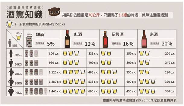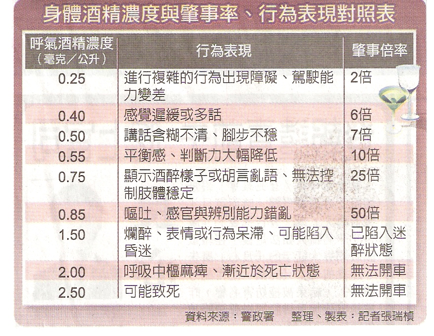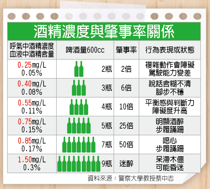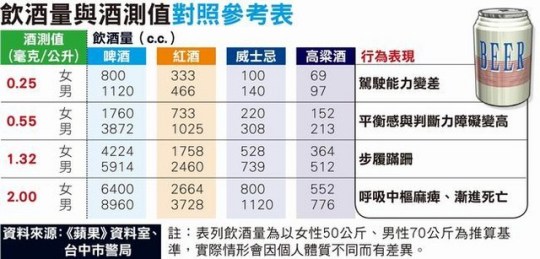 時常看到新聞說酒精濃度,相信一般人不會記得多少數字代表什麼狀態,那就來看圖表吧!