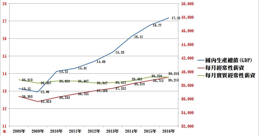➡️2.然而,國民的每月經常性薪資,從36383元上升至39213,上升幅度只有7.7%,遠遠低於GDP上升幅度。