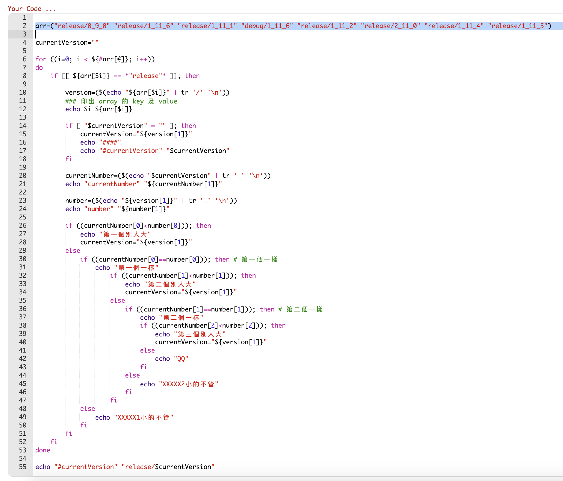 由於Jenkins中需要寫Shell Script來陸續執行某些動作,簡單的都已經打好收工,不過就在要Git Pull下來Release Branch時發生問題,其實就只是想要獲取特定的Branch,只是需要寫點邏輯流程。若是使用最熟悉的Objective C語言肯定沒問題,現在得以Shell Script來實現,不太曉得語法規則的我,只好現學現賣 Shell Script:P~