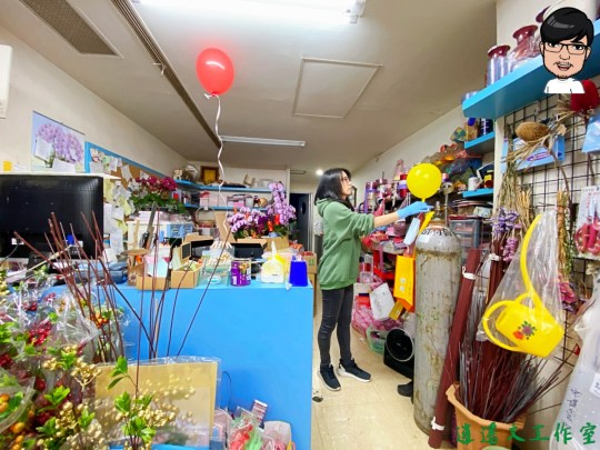 九點準備上車九人座出發,突然想到要買氣球,司機就順勢開到下一個街買兩顆氦氣球(一紅一黃)。
