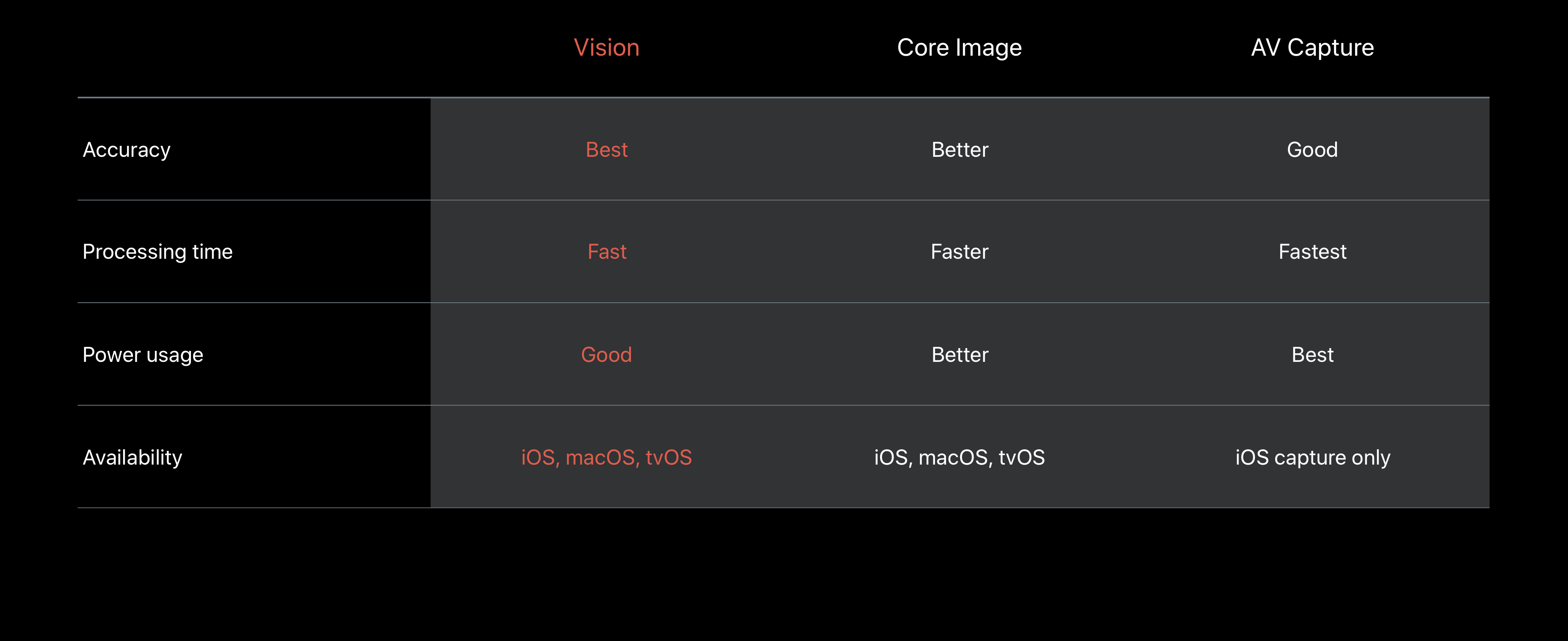 根據官方提供的資料可以看出來,Vision 和 Core Image、AV Capture 在精確度、耗時、耗電量來看基本都是Best、Fast、Good。