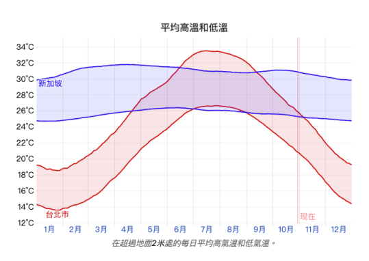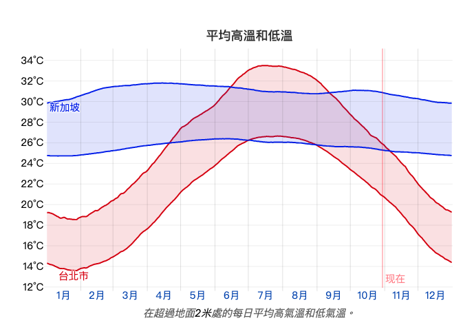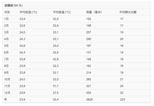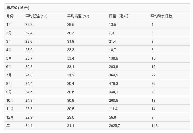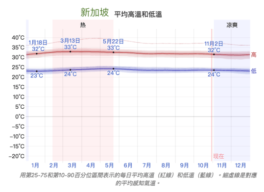 接著來與緯度低的國家比較,就如學校所教,緯度低的地方平均溫度會越高。我特地去找新加坡吉隆坡和菲律賓馬尼拉的全年高均溫和低均溫數據表。