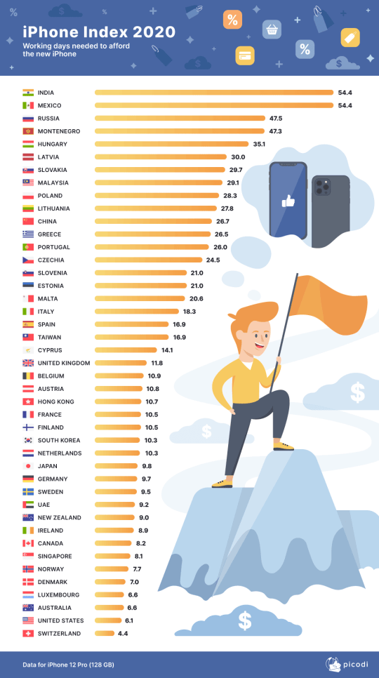 排名最後的是印度及墨西哥,需要工作 54.4 天才能購買 iPhone 12 Pro。