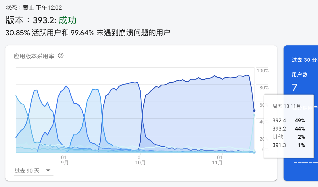 我昨天中午才發布最新版3.9.3,今日採納比例高達44%。一年前我剛接手時,版本是3.6.4。