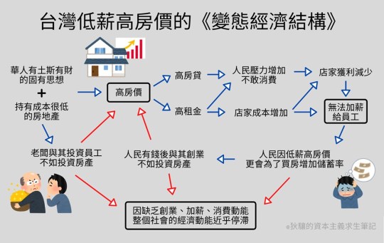 到底是什麼原因造就今日高房價的現象呢?我看到一張圖台灣低薪高房價的生態,充分表達我先前看過的文章,歸納得非常清楚~