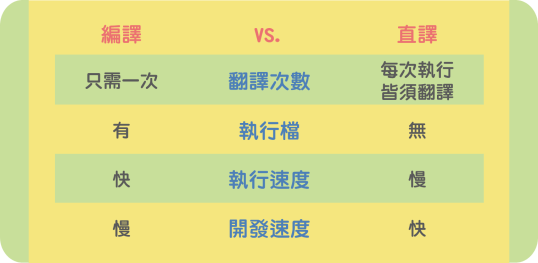 • 編譯式語言只需翻譯一次,而直譯式語言則是每次執行時都需再翻譯。