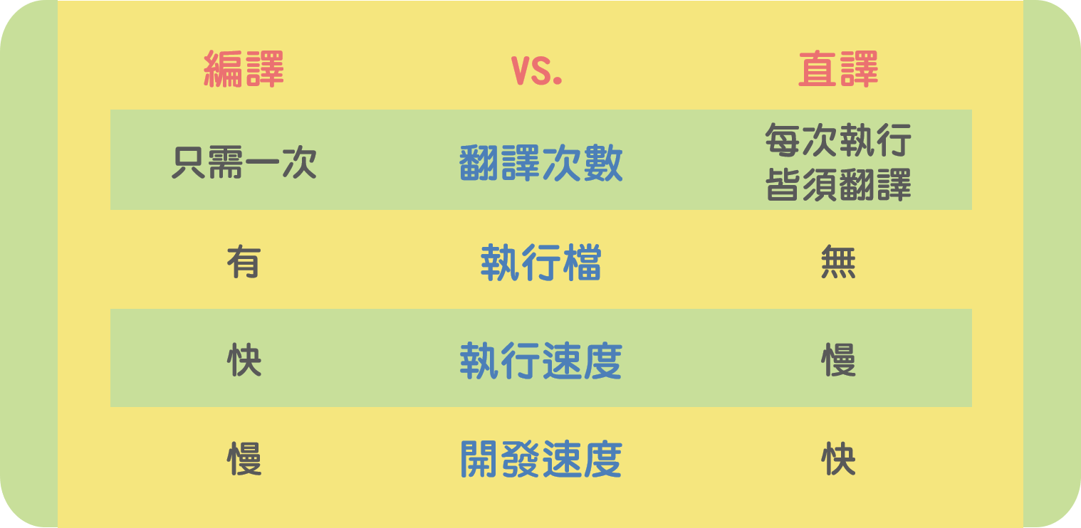 • 編譯式語言只需翻譯一次,而直譯式語言則是每次執行時都需再翻譯。