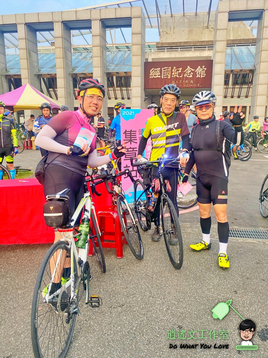 我們幾乎剛好在7點抵達經國紀念館,我可是第一次來到此景點。據說免費參加挑戰的名額有 600 個,我和蔡大哥是有搶到,可惜王大哥慢了一步,完成挑戰可以拿到完騎證書和一個特別的束口袋!雖然只是簡單的兩樣物品,卻激起我們早起來挑戰,是不是人都要有莫名的動力驅使去做某些事呢?