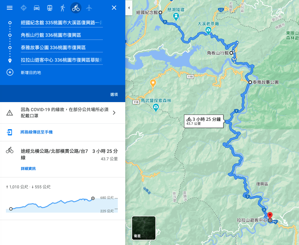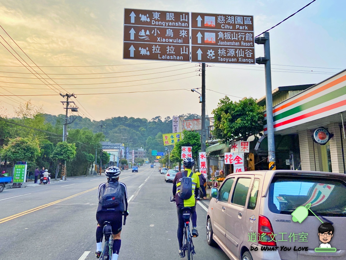 感謝蔡大哥為我們特地去買飯糰豆漿,讓我們先吃飽後再出發,迎接這一項困難度極高的挑戰。一開始真的不知道從頭寮經國紀念館到拉拉山遊客中心,這條路是多麼難騎,全程 42 公里緩坡向上。我看 Google Map 寫 43.7 公里,騎乘腳踏車耗時 3 小時 25 分鐘,還沒有什麼感覺,另外還寫有總爬升 1010 公尺、總滑降 555 公尺,感覺也還好。現在回想,咦?哪來的自信!