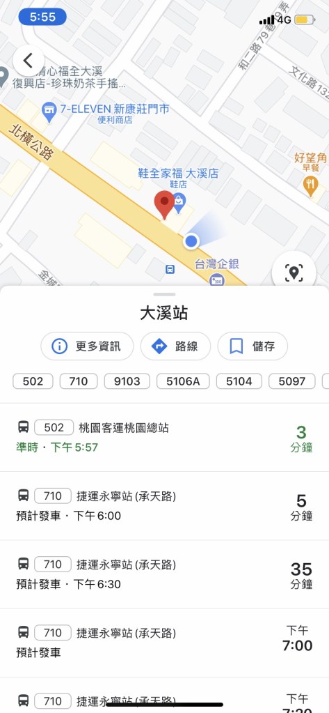 NG3:原以為桃園 710 號公車,從大溪到永寧捷運站,是可以直接上腳踏車。不過 6:00 那班公車司機情緒激動,說腳踏車不能上、不能上,手還一邊左右擺動。蔡大哥跟他說網路上查到是可以,司機回說政策會一直改變,最好打電話詢問。我在一旁問,如果拆掉後包起來應該可以上車?此刻司機回答是可以,不過他可不等我們,時間一到就要出發,我說我們等下一班 6:30。看來這位司機沒有以乘客為考量,怕麻煩就只是按照規定做。我們一致認為這位司機做得不好,至少好好說話啦~