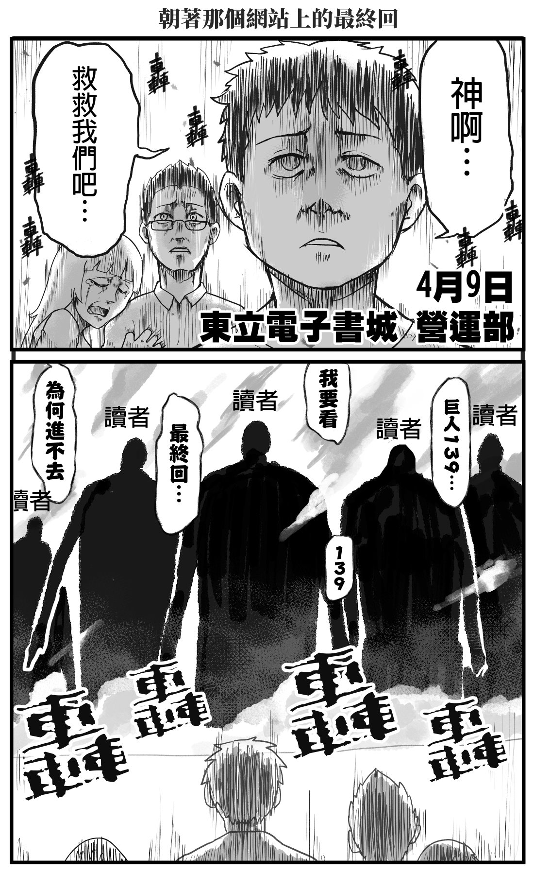 作者諫山畫了11年,2021/4/9釋出最後的139話,受眾矚目使得東立電子書城網站好幾度進不去,我還得去下載東立電子書城App來看⋯⋯🤗